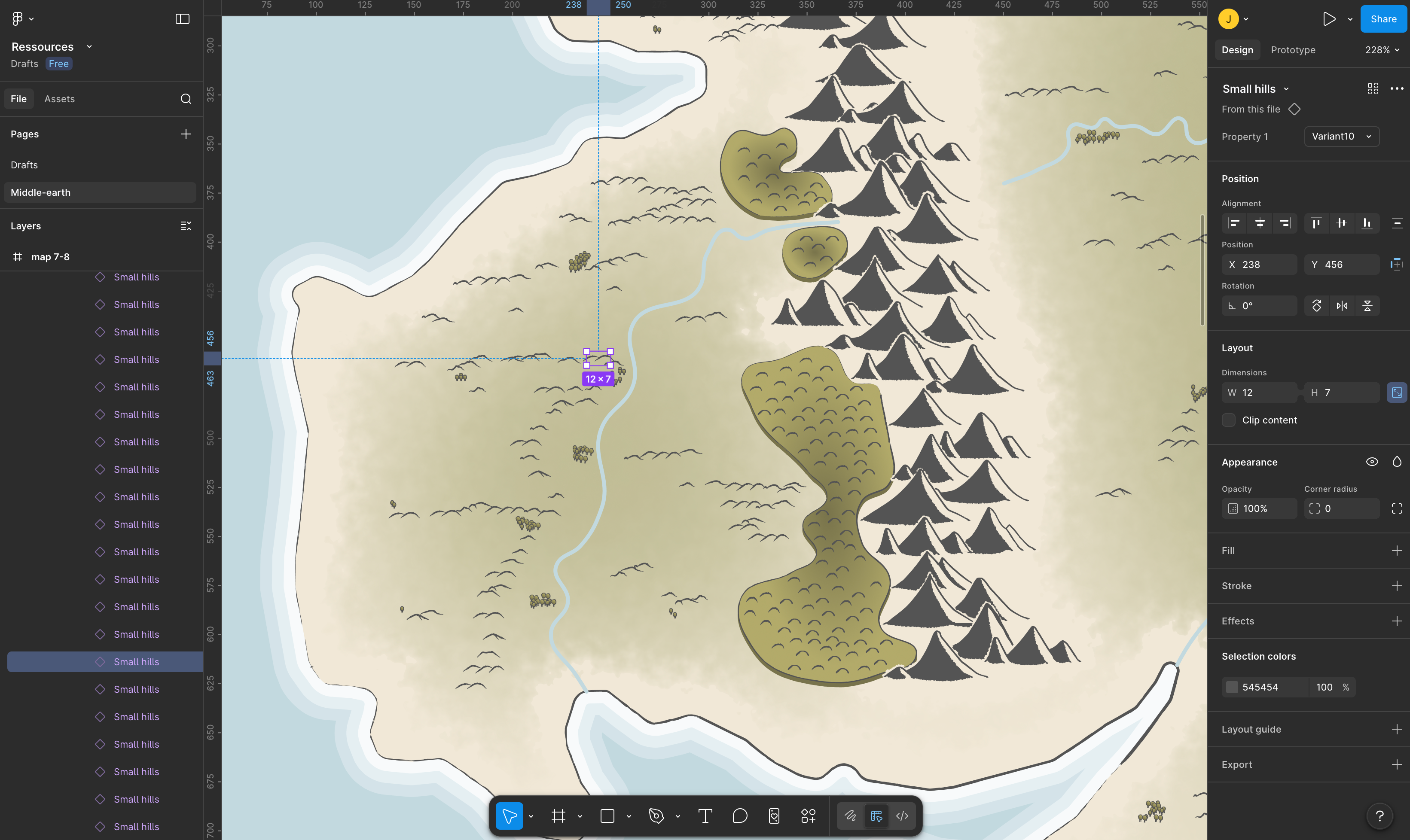 I'm using this MERP map below as a source of inspiration for placing relief and vegetation on the map.