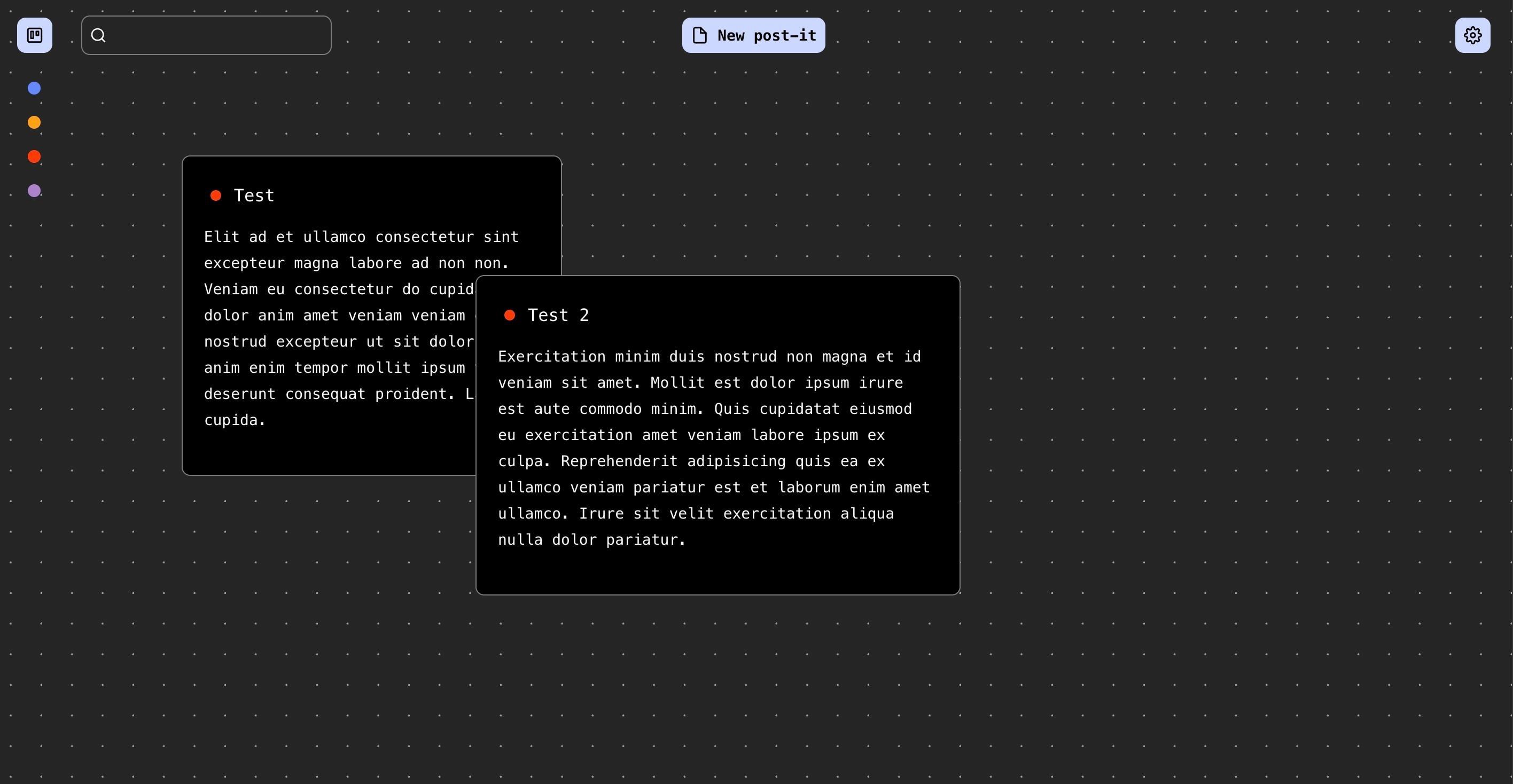 Just Post-It is a focused note workspace designed around spatial thinking. You can place notes freely, keep context visible, and iterate quickly without rigid columns or folders.