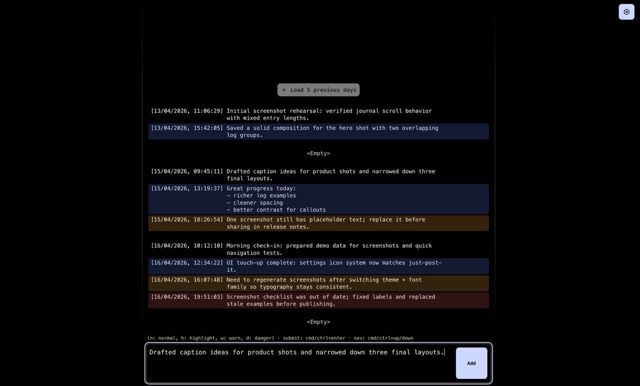 Logs is a focused writing space for daily progress notes, launch checklists, and release breadcrumbs. You can capture thoughts in seconds, keep them grouped by day, and retain full ownership with plain JSON files.